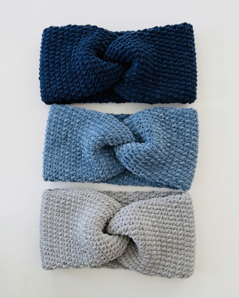 The pattern I used is based on the Mixed Loop Headbands. Where I am making a tube and then sewing them together, the difference is that I am using wide HDC, working between the posts of each HDC. They are double-thick and hold their shape after repeated use. For the last few years, making the headbands double-thick has been our favorite way of making them.