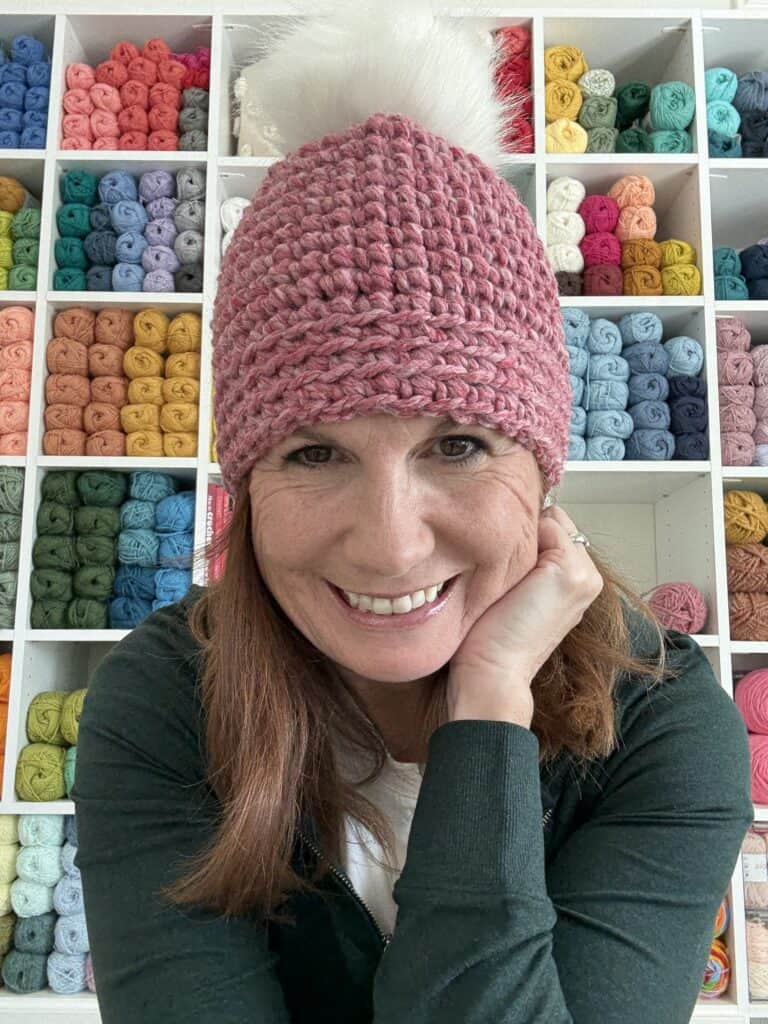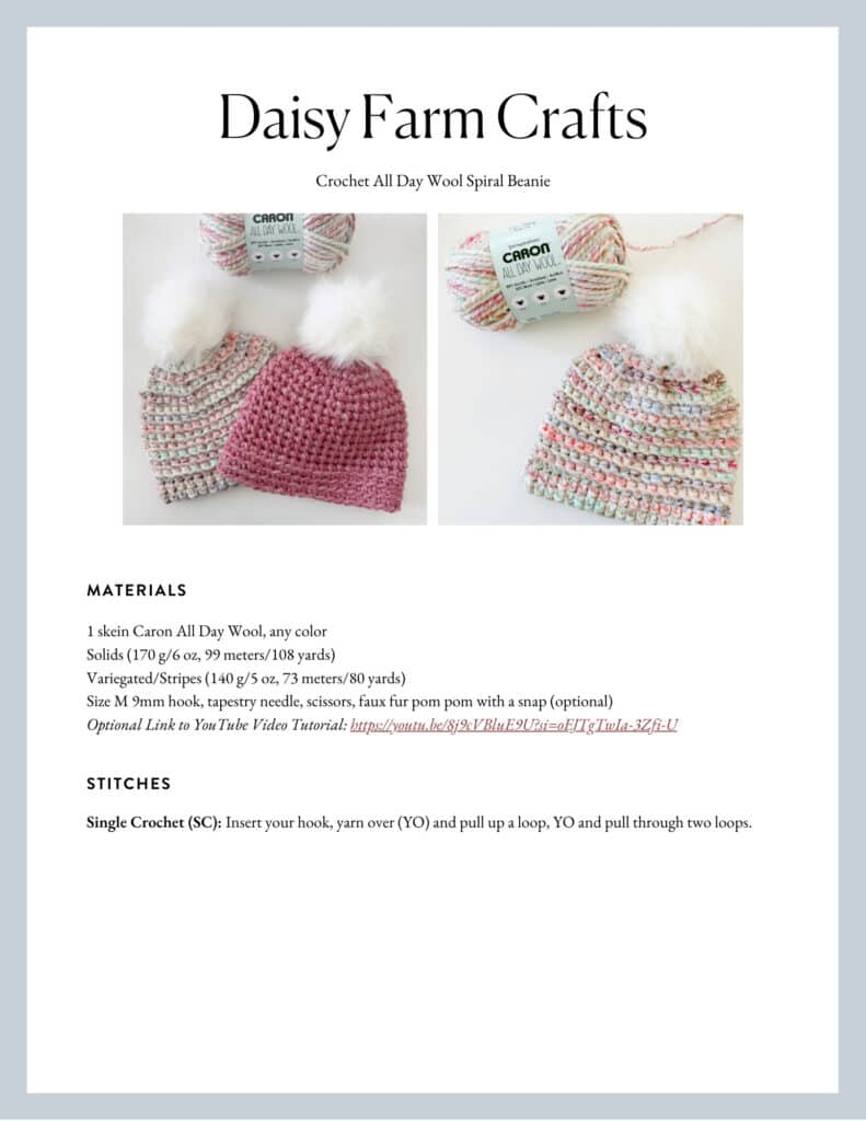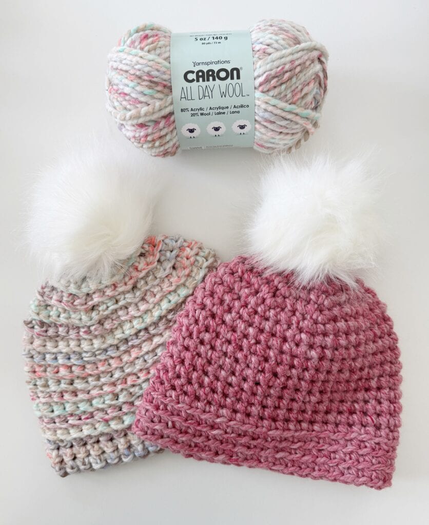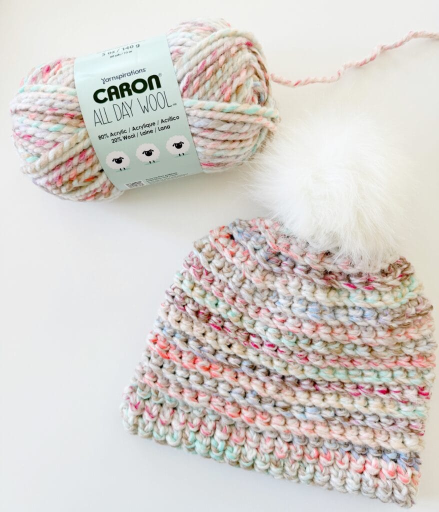 I can’t decide which side I like best! But I absolutely love Caron All Day Wool. Currently, you can shop at Yarnspirations.com, and a single skein costs $6.49. That’s all you need to make one hat.