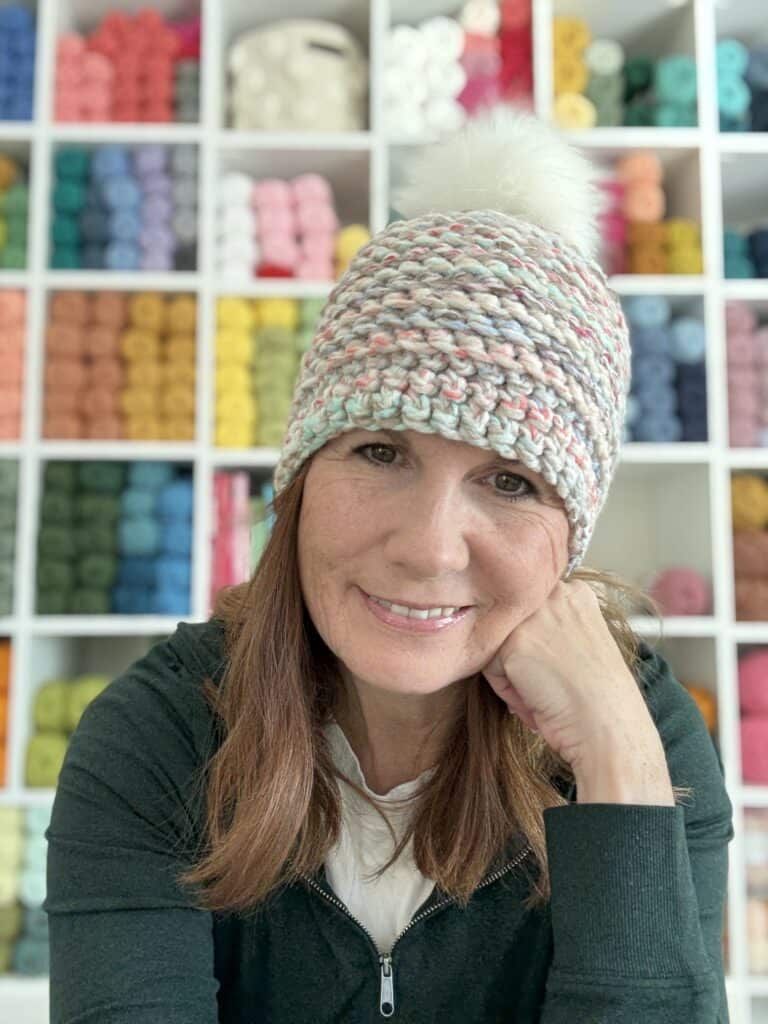 Be sure to shop for your snap-on pom poms from *Amazon. I used the 6-inch size for this hat.