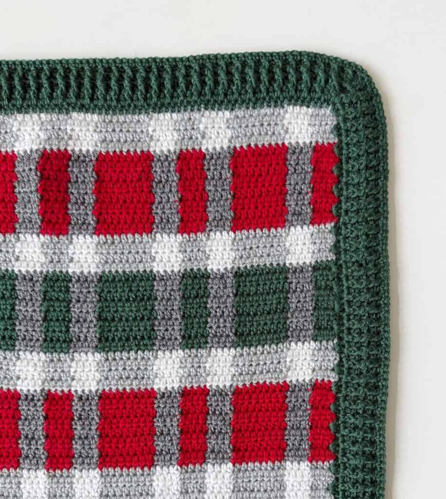 This blanket is really not much different than my gingham blankets. I’m adding a bit more color as I’m using two shades of gray, red, green and white. Once you realize the blanket alternates between two colors at a time, it’s a breeze to keep track of.