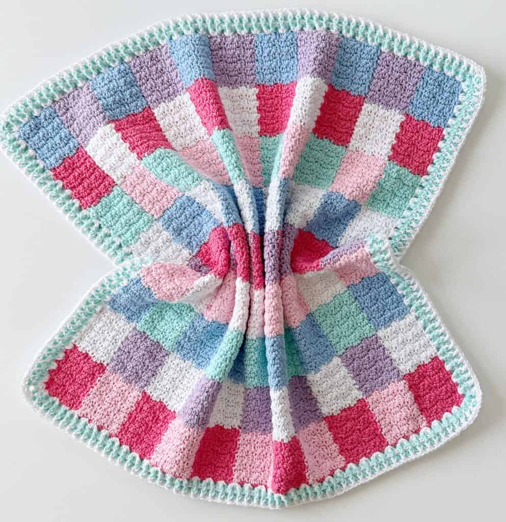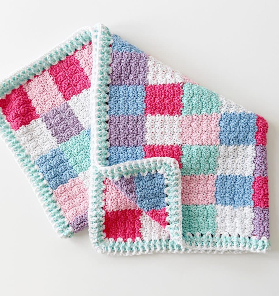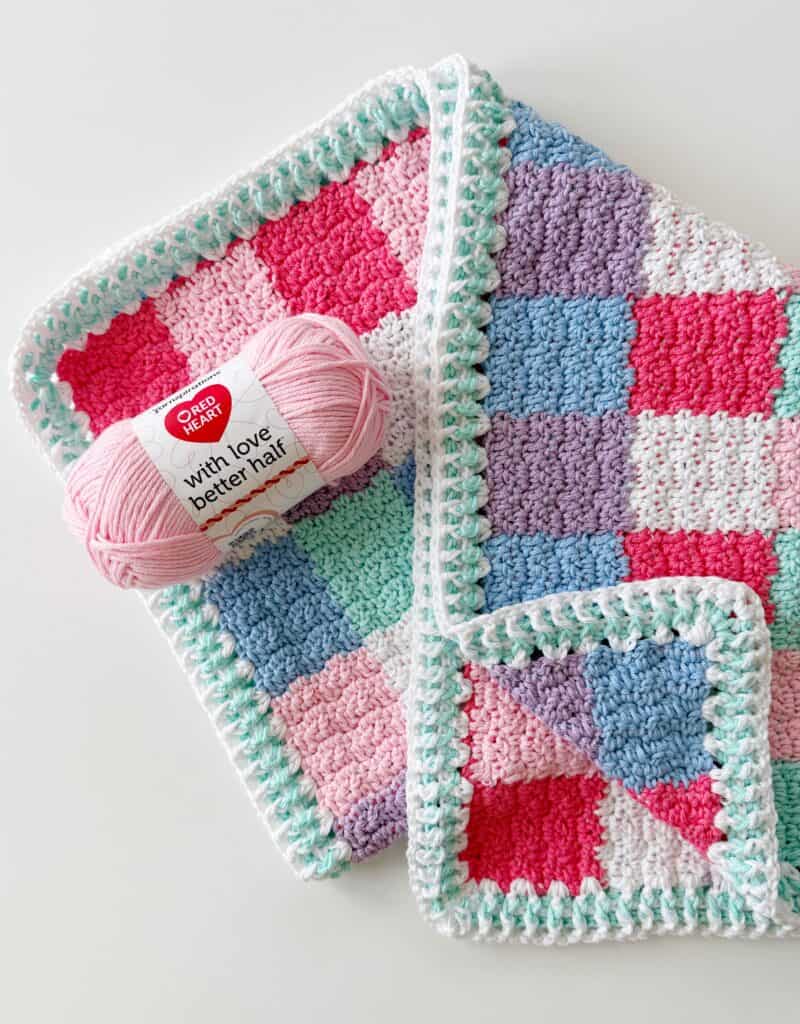 If you have never made any of our Gingham Baby Blankets, I’m going to encourage you to watch the video tutorial for this pattern (it’s linked after the pattern section) so you can learn the tips and tricks for carrying yarn along the row and how to switch colors mid-row without the yarn twisting on you. It’s a game-changer to learn a few tips in order to make this blanket work up with ease.