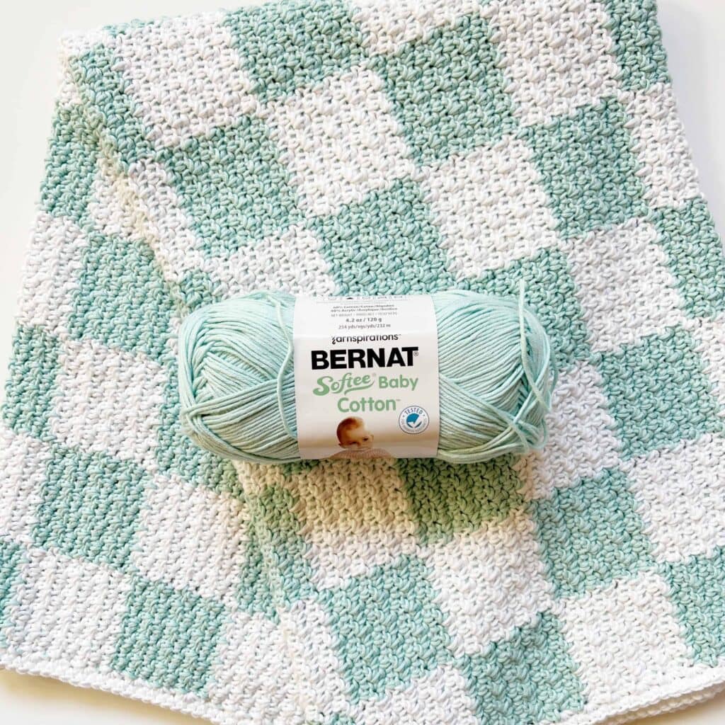 My daughter Annie asked me to make a checkerboard blanket for her friend’s new baby boy, and I was happy to do it! I don’t pass up any opportunity to make a checkerboard or a gingham blanket. They are still my favorite blankets to make. I love using Bernat Softee Cotton for baby shower gifts. It’s perfect.