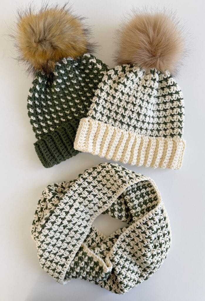 The hat and scarf are a two-tone design, using one skein of a light color and one of a dark color for each piece.