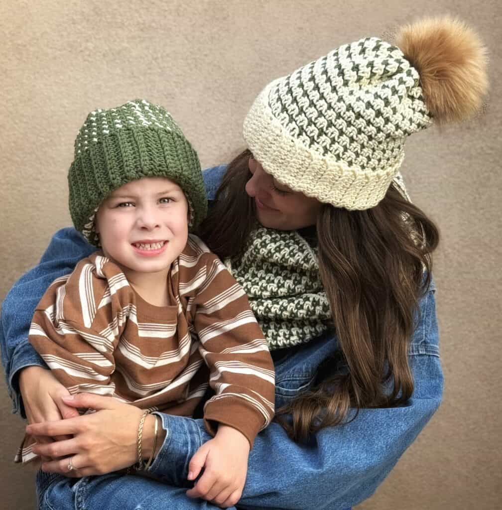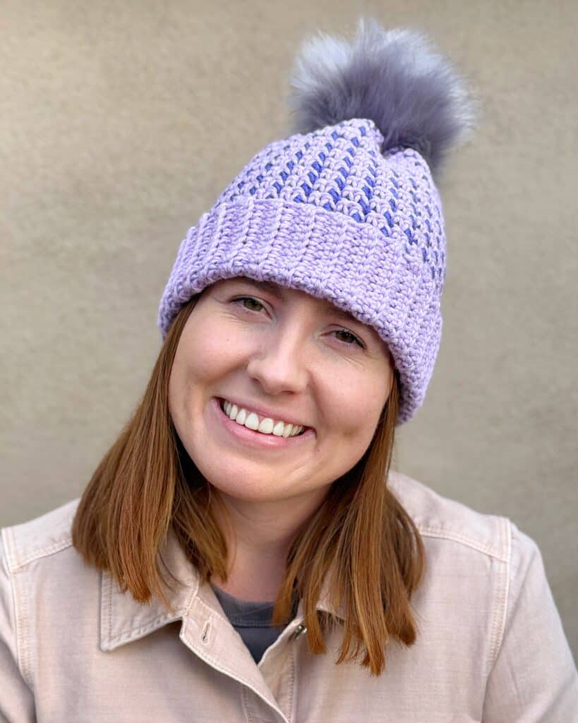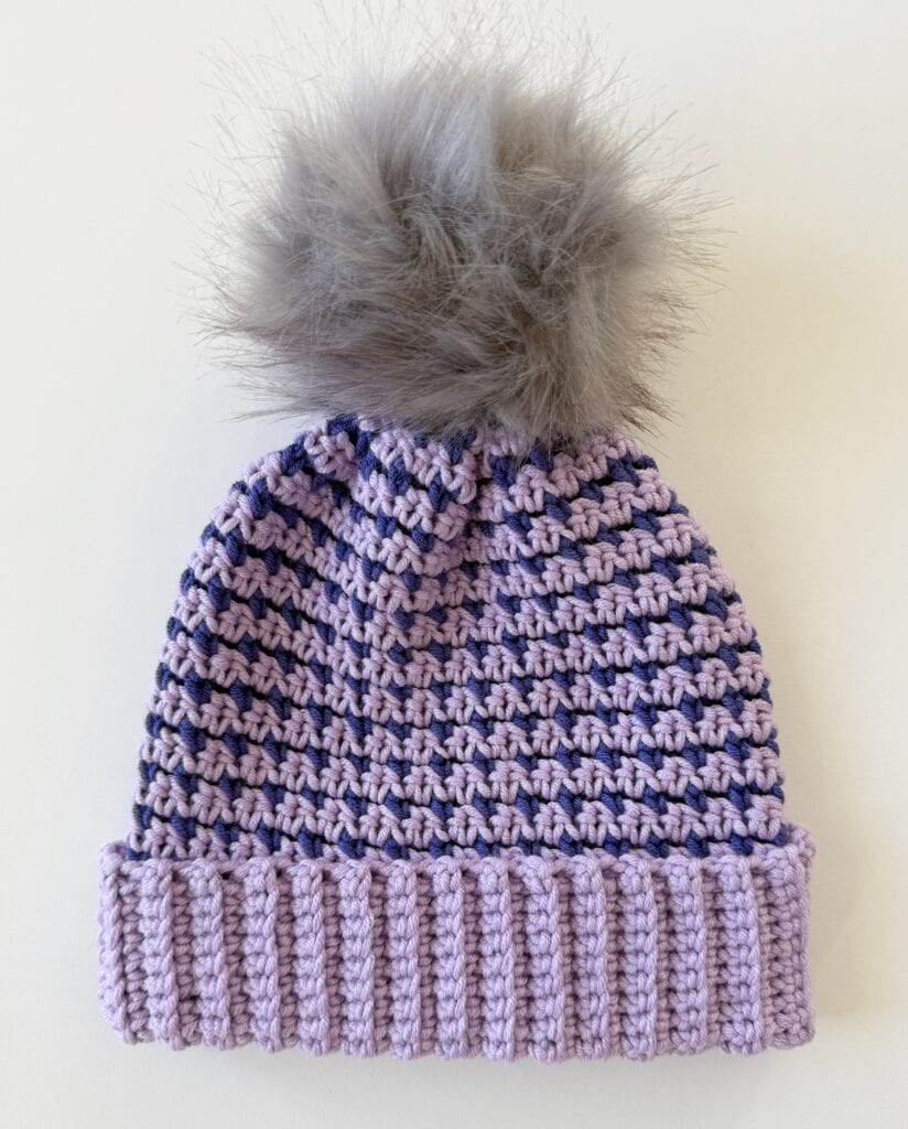 The hat is worked from the brim up using single crochet stitches. It’s finished with an optional faux fur pom pom (6-inch for adults or 4-inch for infants.) It can also be left plain.