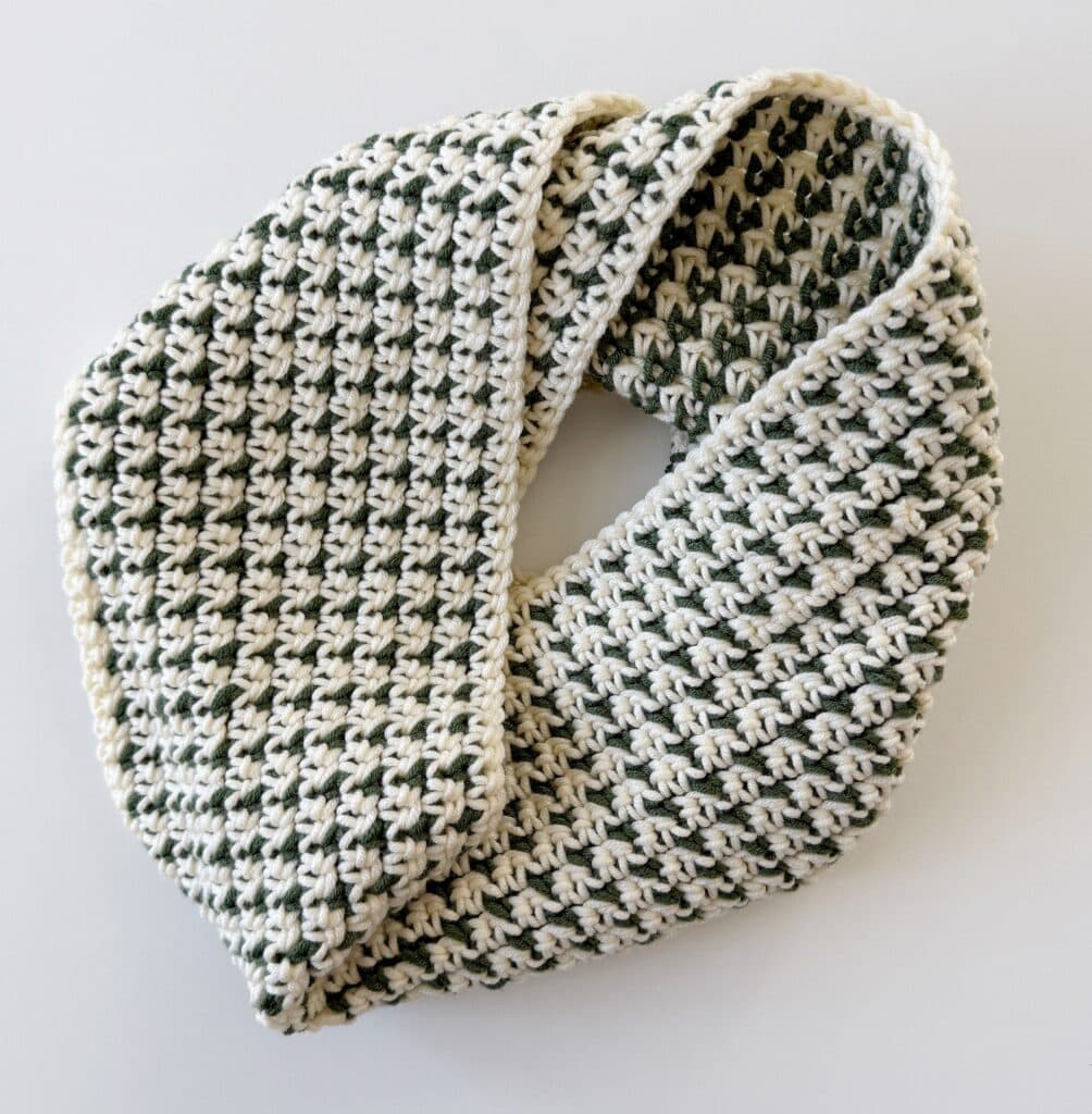 The infinity scarf complements the hat beautifully, using the same easy stitch pattern. It’s worked in the round and can be adjusted in length or width to your preference.